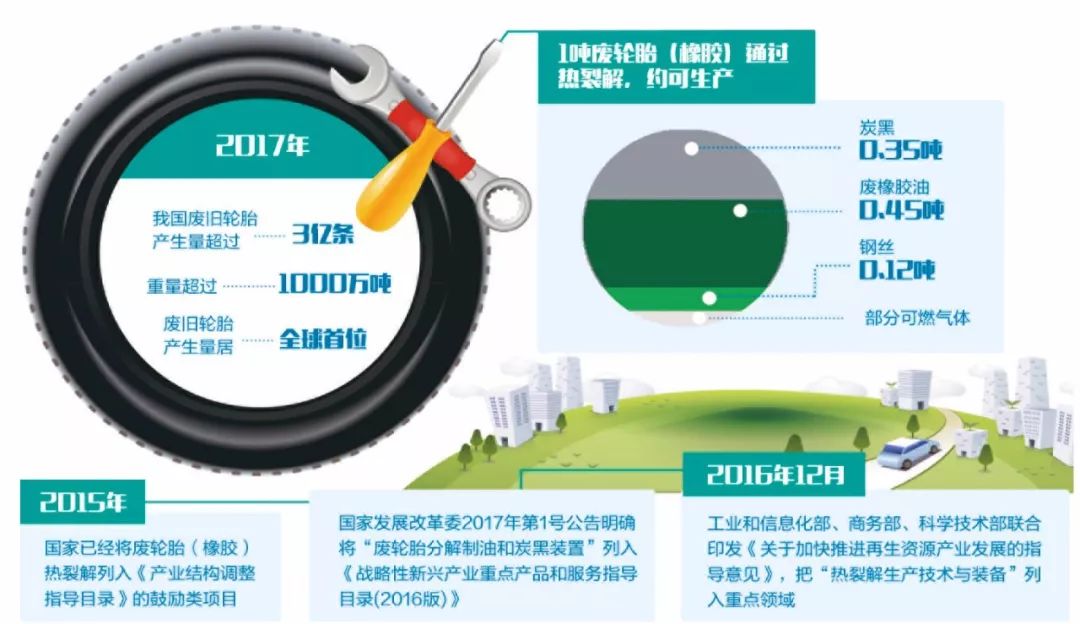 2015年,國家已經(jīng)將廢輪胎(橡膠)熱裂解列入《產(chǎn)業(yè)結構調(diào)整指導目錄》的鼓勵類項目。國家發(fā)展改革委2017年第1號公告明確將“廢輪胎分解制油和炭黑裝置”列入《戰(zhàn)略性新興產(chǎn)業(yè)重點產(chǎn)品和服務指導目錄(2016版)》,2016年12月份,工業(yè)和信息化部、商務部、科學技術部聯(lián)合印發(fā)《關于加快推進再生資源產(chǎn)業(yè)發(fā)展的指導意見》,把“熱裂解生產(chǎn)技術與裝備”列入重點領域。
