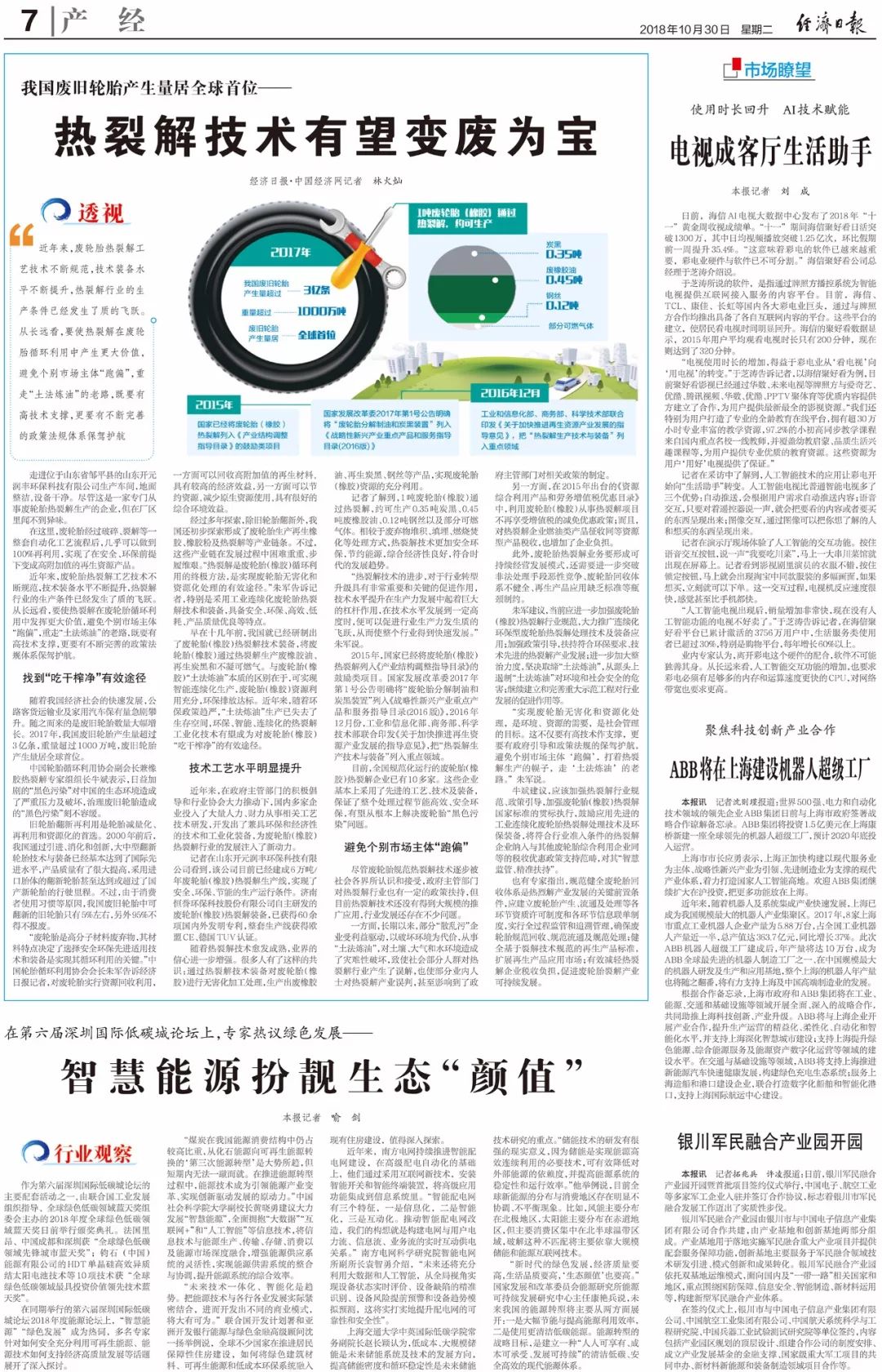 近日,《經(jīng)濟日報》 、《中國經(jīng)濟網(wǎng)》主任記者林火燦采訪了中國輪胎循環(huán)利用協(xié)會會長朱軍以及中國輪胎循環(huán)利用協(xié)會副會長兼橡膠熱裂解專家組組長、濟南恒譽環(huán)??萍脊煞萦邢薰径麻L牛斌及行業(yè)相關專業(yè)人士,并參觀了采用濟南恒譽環(huán)保技術裝備,入選工信部《廢輪胎綜合利用行業(yè)準入條件》的廢輪胎熱裂解項目,就廢輪胎污染、循環(huán)再生利用技術、熱裂解行業(yè)發(fā)展前景及相關政策等問題與各位專家進行了深入交流。并依據(jù)采訪內(nèi)容撰寫題為《我國廢舊輪胎產(chǎn)生量居全球首位——熱裂解技術有望變廢為寶》的文章,刊登于《經(jīng)濟日報》。