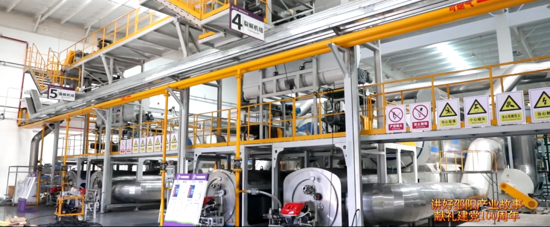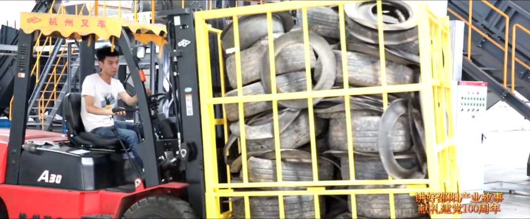 “一輛輛小車(chē)滿(mǎn)載著廢舊輪胎進(jìn)入廠區(qū),卸下的廢舊輪胎隨即被運(yùn)送到上料區(qū),經(jīng)過(guò)智能切割和清洗后再運(yùn)送到智能裂解裝備中”;