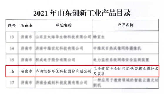 日前,山東省工業(yè)和信息化廳公布了《2021年山東創(chuàng)新工業(yè)產(chǎn)品目錄》,濟(jì)南恒譽(yù)環(huán)保科技股份有限公司“工業(yè)連續(xù)化含油污泥熱裂解成套技術(shù)及裝備”強(qiáng)勢(shì)上榜。
