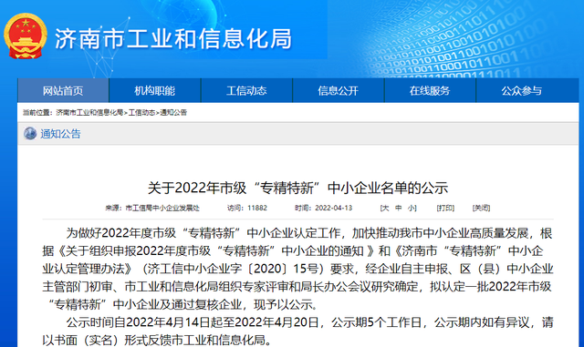 為做好2022年度市級“專精特新”中小企業(yè)認(rèn)定工作,加快推動濟(jì)南市中小企業(yè)高質(zhì)量發(fā)展,根據(jù)《關(guān)于組織申報2022年度市級“專精特新”中小企業(yè)的通知 》和《濟(jì)南市“專精特新”中小企業(yè)認(rèn)定管理辦法》(濟(jì)工信中小企業(yè)字〔2020〕15號)要求,經(jīng)企業(yè)自主申報、區(qū)(縣)中小企業(yè)主管部門初審、市工信局組織專家評審和局長辦公會議研究確定,市工信局公示了2022“專精特新”中小企業(yè)認(rèn)定名單及復(fù)核企業(yè)名單。濟(jì)南恒譽(yù)環(huán)??萍脊煞萦邢薰卷樌ㄟ^復(fù)核。