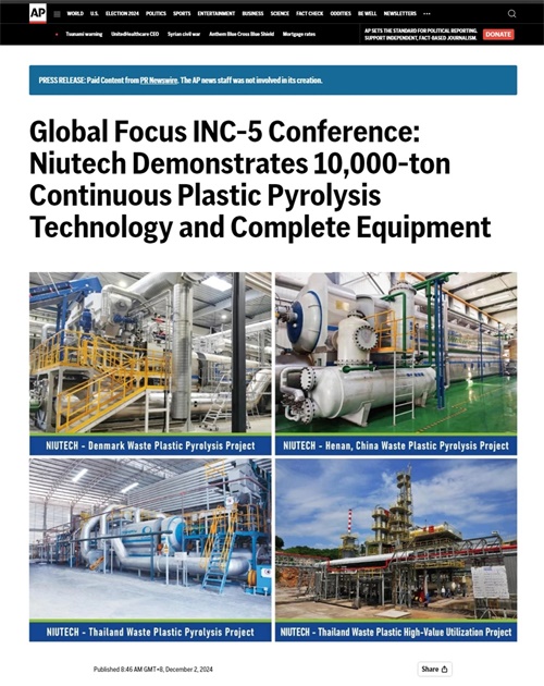 第五屆政府間塑料污染談判委員會(INC-5)在INC-5會議期間,美國最大的通訊社,將關(guān)注重點從會場內(nèi)轉(zhuǎn)向會場外,,并以“Niutech Demonstrates 10,000-ton Continuous Plastic Pyrolysis Technology and Complete Equipment”為題,報道了恒譽環(huán)保在丹麥、泰國、韓國及中國本土,持續(xù)穩(wěn)定運行數(shù)年的多個。“全球廢塑料污染治理,離不開先進技術(shù)的支撐,其中來自中國的恒譽環(huán)保,,安全環(huán)保地將廢塑料變?yōu)樵偕Y源產(chǎn)品,減少了環(huán)境污染的同時,為經(jīng)濟綠色發(fā)展做出貢獻,為全球廢塑料污染治理提供了示范案例。