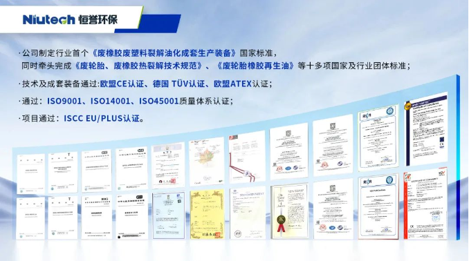行業(yè)標(biāo)準(zhǔn)制定:2016年公司制定的《廢橡膠廢塑料裂解油化成套生產(chǎn)裝備》國(guó)家標(biāo)準(zhǔn)正式頒布,是行業(yè)首個(gè)國(guó)家標(biāo)準(zhǔn),同時(shí)還牽頭完成《廢輪胎、廢橡膠熱裂解技術(shù)規(guī)范》、《廢輪胎橡膠再生油》、《廢舊輪胎裂解炭黑》等十多項(xiàng)國(guó)家及行業(yè)團(tuán)體標(biāo)準(zhǔn)
